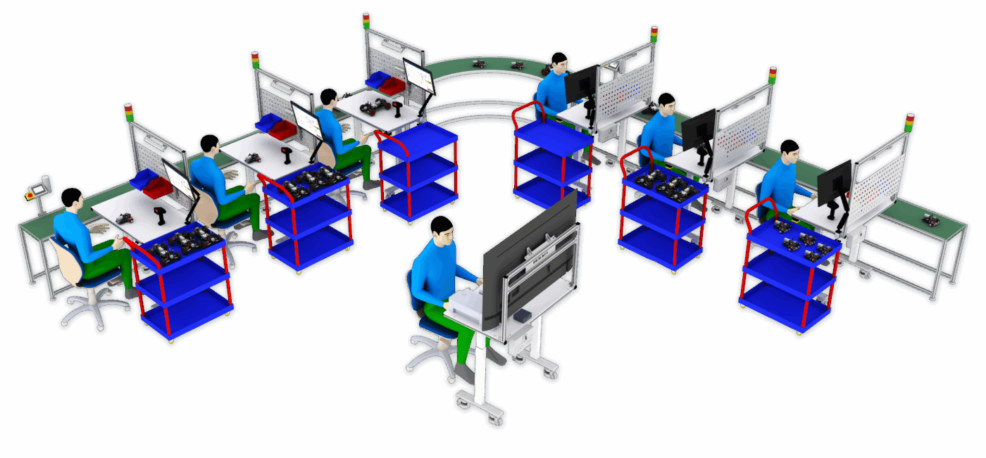 - การจัดสมดุลสายการผลิตเต็มรูปแบบ (Line Balancing): สามารถกำหนดจำนวนสถานีที่มากขึ้นหรือน้อยลงที่ผู้เรียนจะได้ฝึกฝนการวิเคราะห์และจัดสมดุลสายการผลิตเพื่อลดปัญหาคอขวด (Bottleneck) ที่อาจเกิดขึ้นพร้อมกันหลายจุด