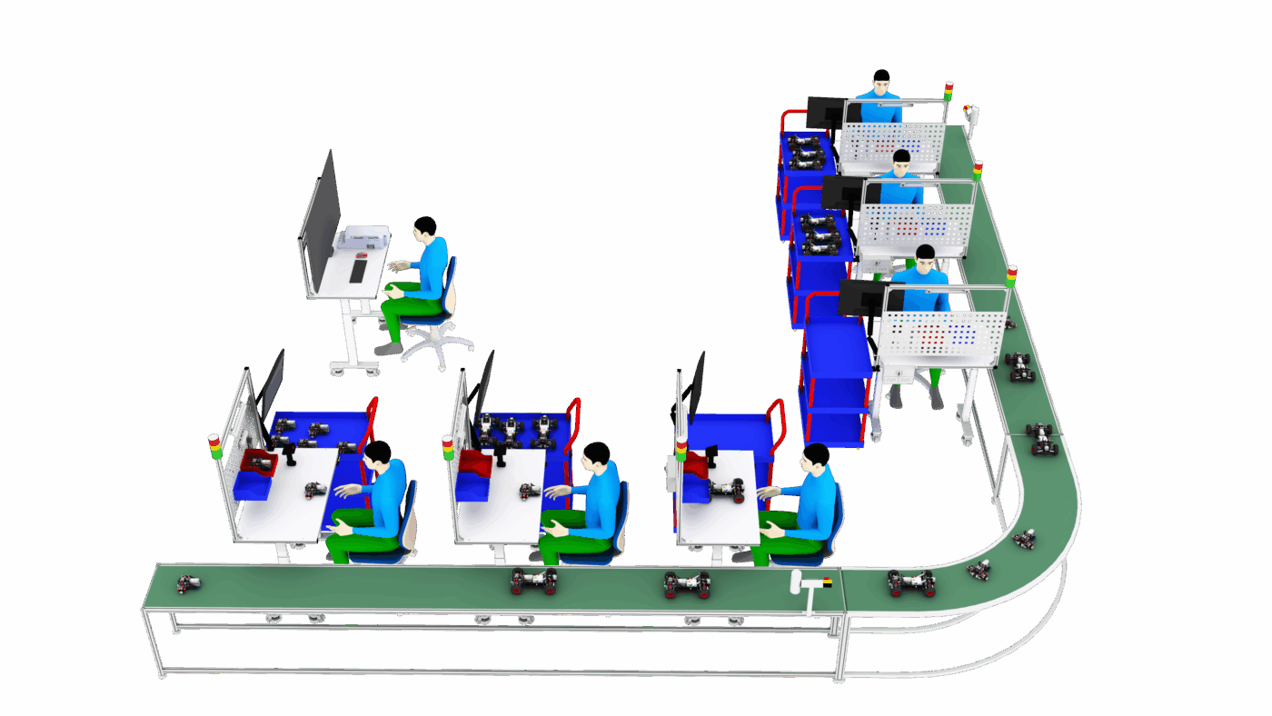 - การจัดสมดุลสายการผลิตเต็มรูปแบบ (Line Balancing): สามารถกำหนดจำนวนสถานีที่มากขึ้นหรือน้อยลงที่ผู้เรียนจะได้ฝึกฝนการวิเคราะห์และจัดสมดุลสายการผลิตเพื่อลดปัญหาคอขวด (Bottleneck) ที่อาจเกิดขึ้นพร้อมกันหลายจุด